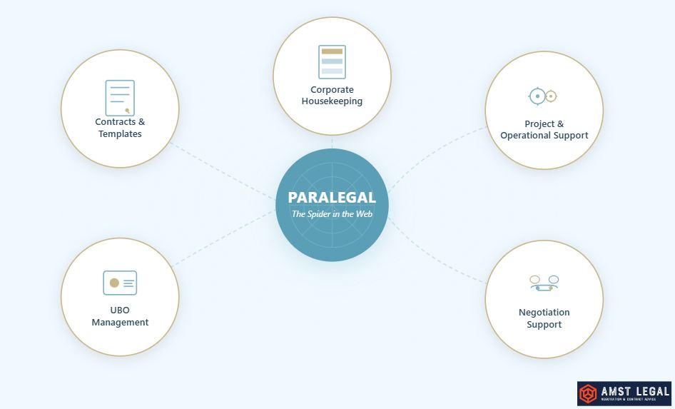 Den verkliga styrkan hos en paralegal ligger dock i hur dessa funktioner kombineras. Många paralegals beskriver sig själva som ”spindeln i nätet”, som den som skapar struktur och effektivitet mellan avdelningar. Det beskriver deras centrala roll i att förena juridiska, kommersiella och finansiella processer.