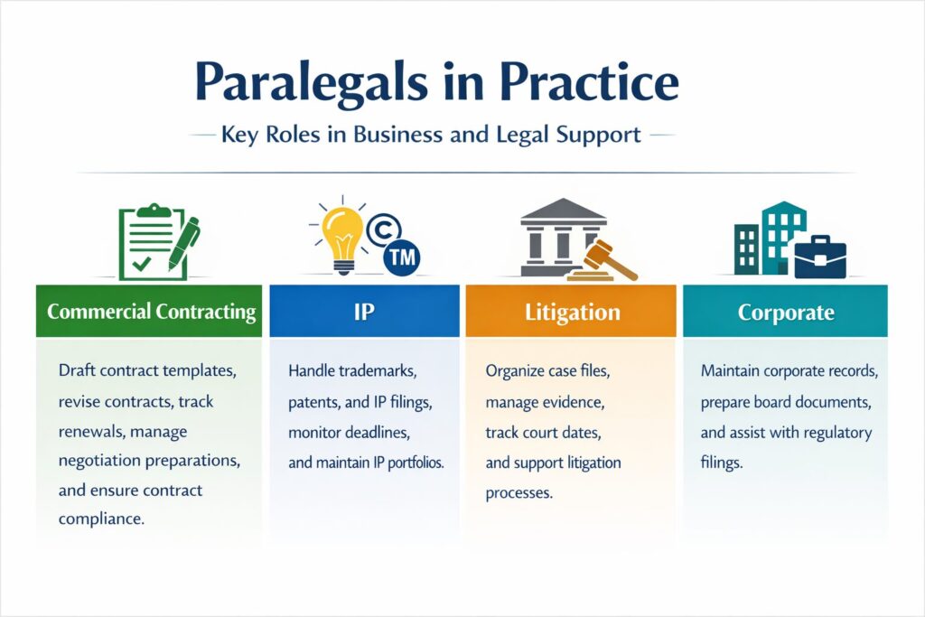 Sammanfattningsvis hanterar de vanligtvis det tidskrävande förberedande arbetet för advokater eller jurister. Bland annat hanterar paralegals flertal dokument av vikt för varje företagsverksamhet.